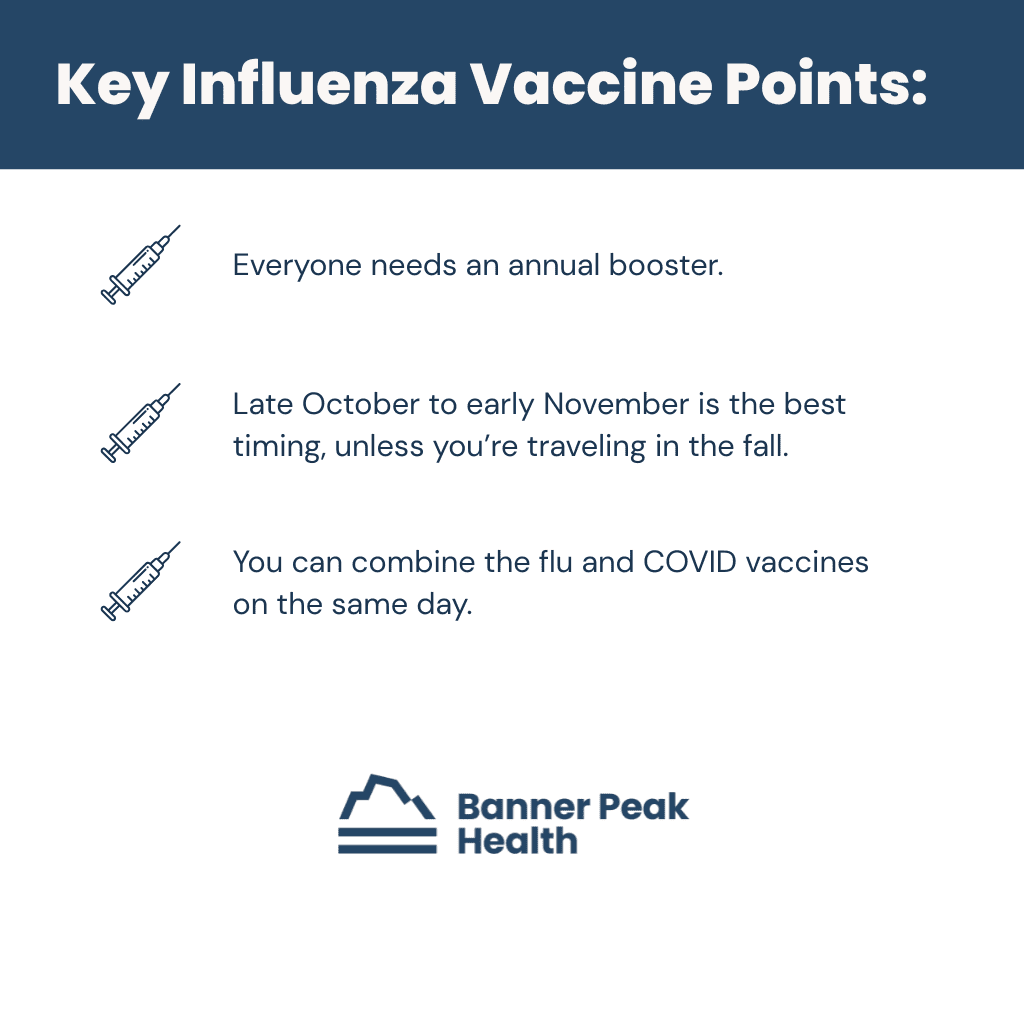 We recommend you wait until October to receive your influenza vaccination. A slight delay ensures the vaccine’s three to four months of peak protection come a bit later in the flu season, which peaks late in California and can last through April/May.